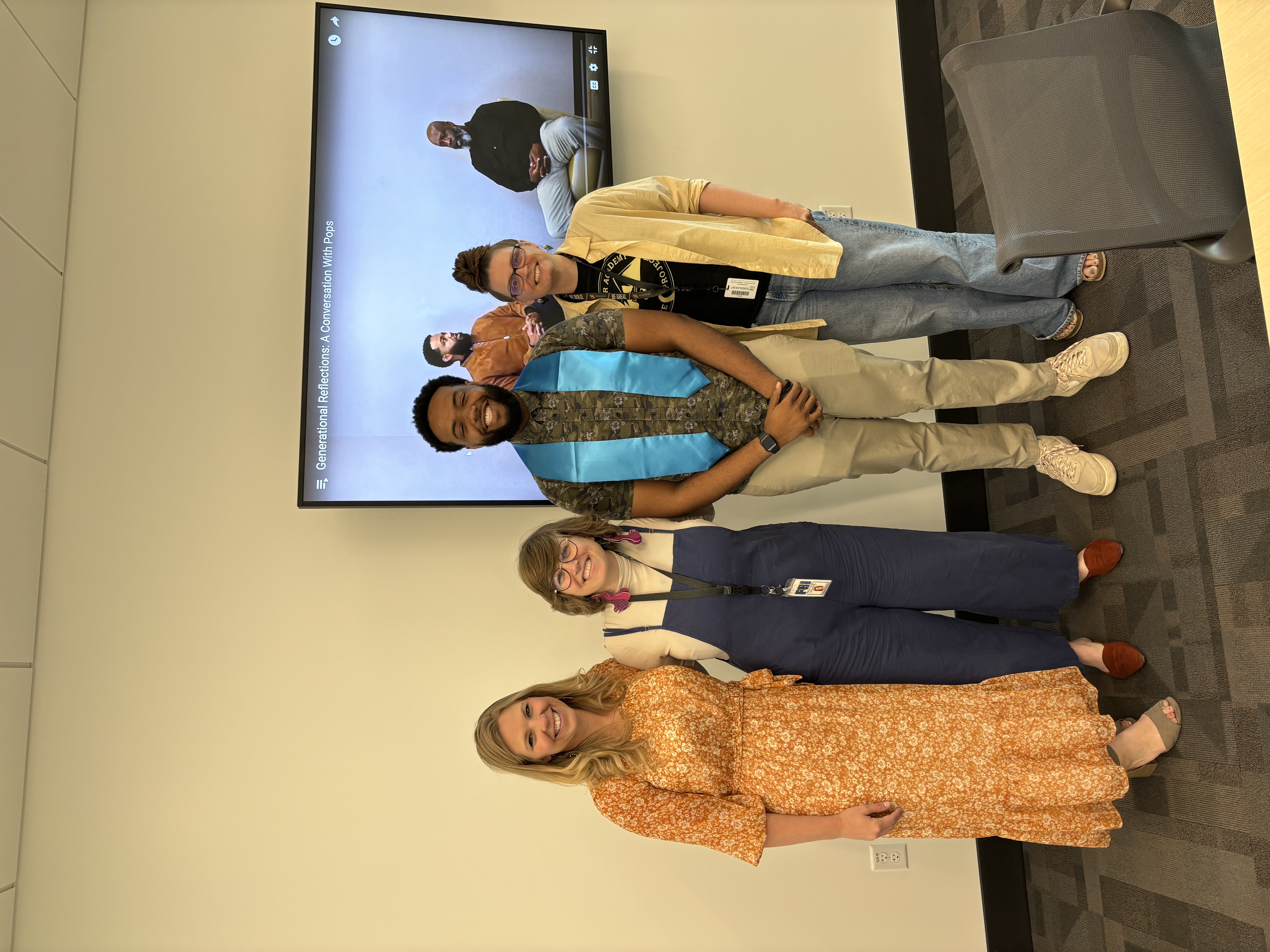 - Julian Haywood wearing his honors stole, standing with his committee. From left to right: Laura Decker, Molly Appel (advisor), Julian Haywood, Christine Beaudry.