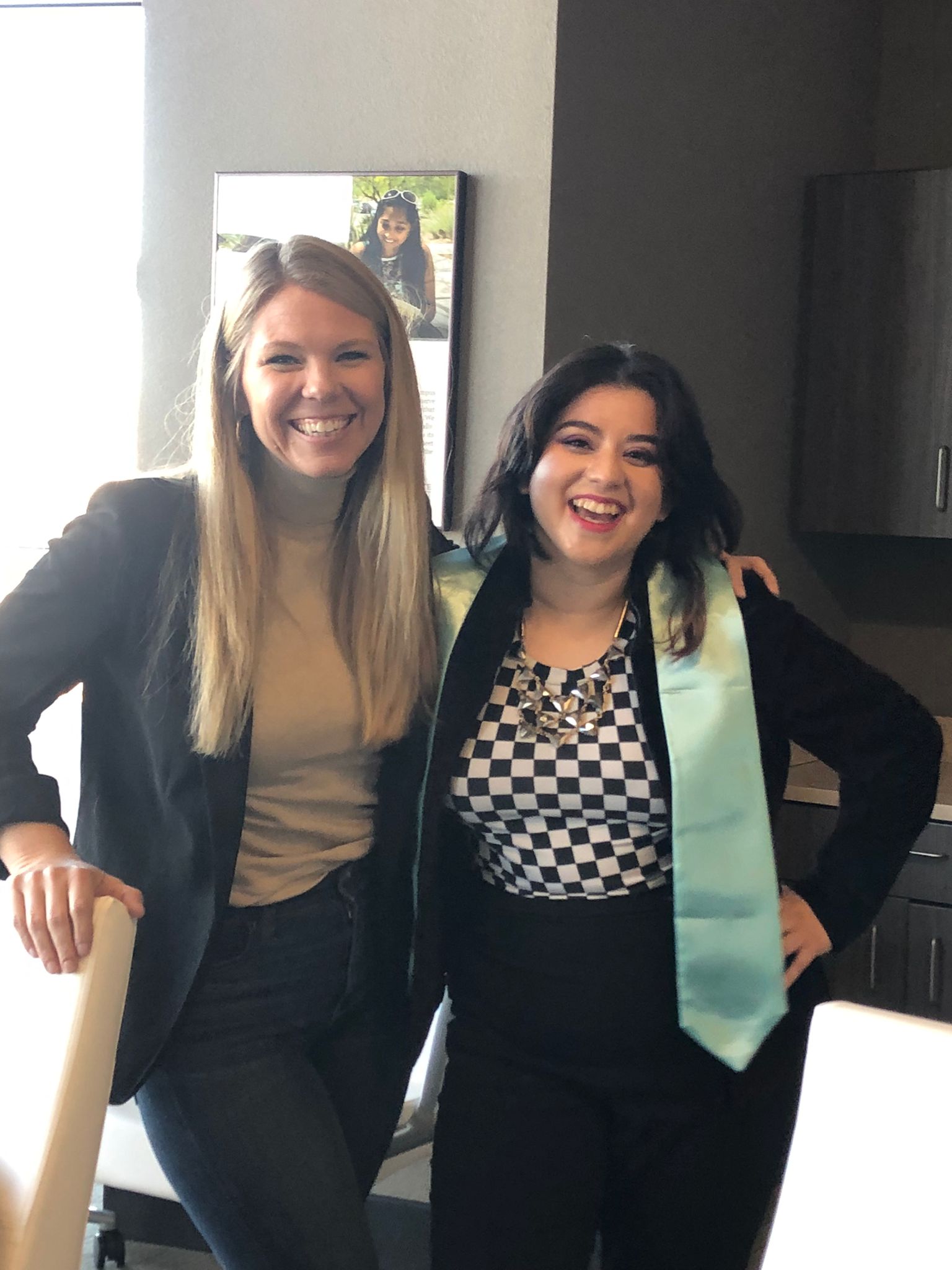 - Liz Galvez wearing her honors stole, standing with her advisor, Laura Decker.
